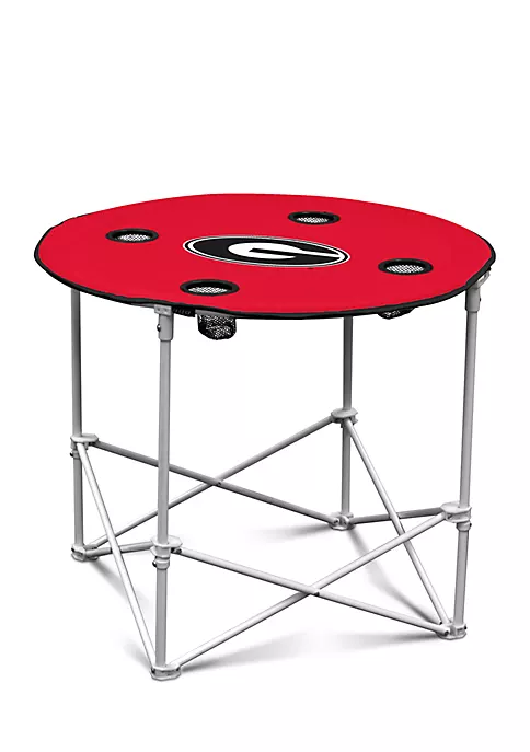 This Georgia Round Table is a necessity for your next tailgate or outdoor event. It features a large Bulldog logo in the center with coordinating trim. With a sturdy surface and four cup holders, it is ideal for a food spread or gathering around with friends. The table top removes from the base and folds in half for storage while being easily transported to-and-fro in the matching zip-up bag with shoulder strap.